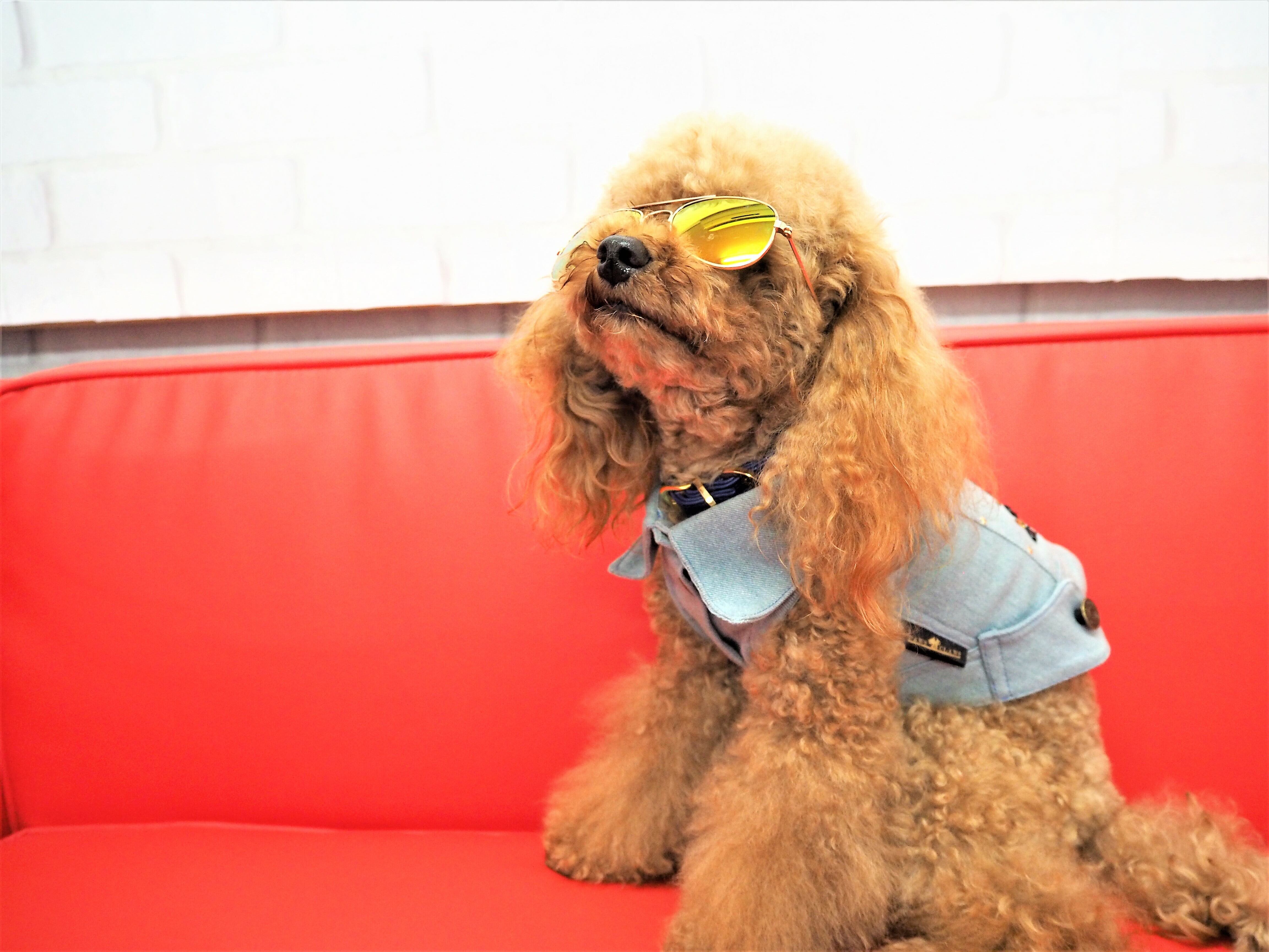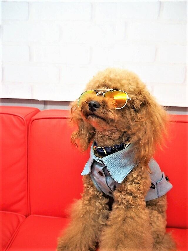 イエローオレンジのワンちゃん用のサングラスです。