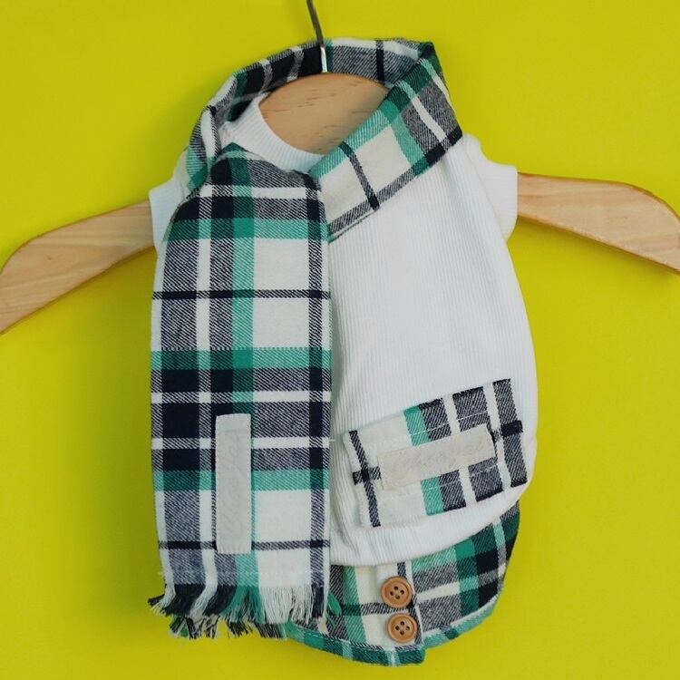 トップス J43 J44 ライトグリーン ダークグリーン チェック マフラー付き 重ね着風 シンプル ナチュラル カジュアル 上品 ドッグウェア dog 犬 猫 ペット 服 犬服 オシャレ かわいい 小型犬 返品交換不可 | MOANA