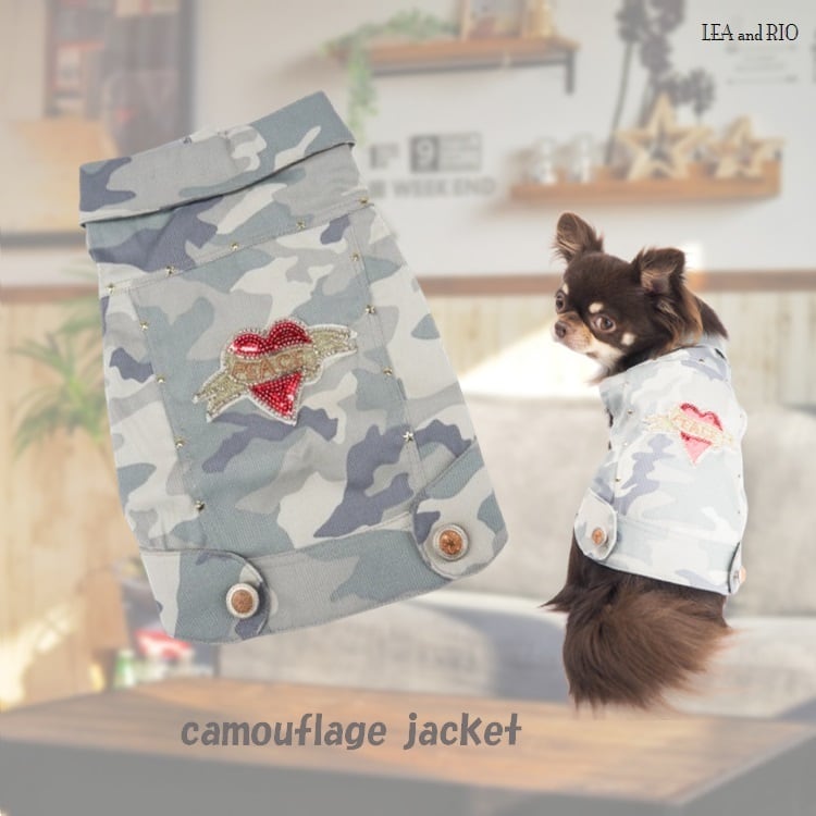 トップス P124 デニム ドックウェア ジャケット ハンドメイド アウター ライト カモフラージュ 迷彩柄 ハート キラキラ ビジュー ストーン ドッグウェア dog 犬 猫 ペット 服 犬服 猫服 オシャレ クール 小型犬 リンク コーデ 返品交換不可 | MOANA
