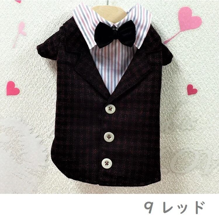 トップス PE8 PE9 ベスト風 タキシード スーツ フォーマル シルバー レッド 蝶ネクタイ リボン チェック柄 ドッグウェア 犬 猫 ペット 服 犬服 猫服 犬の服 猫の服 おしゃれ かっこいい クール シャツ