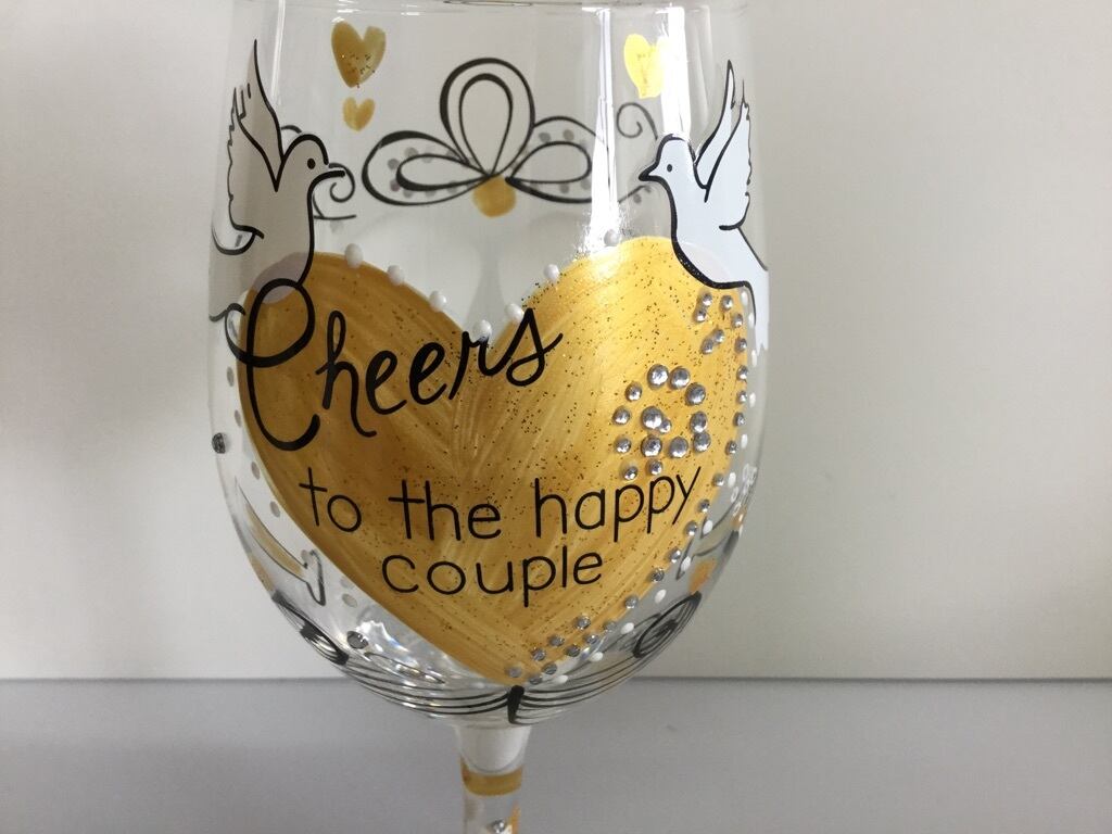 金色のハートや小鳥など描かれストーンが散りばめられた素敵なグラスです。